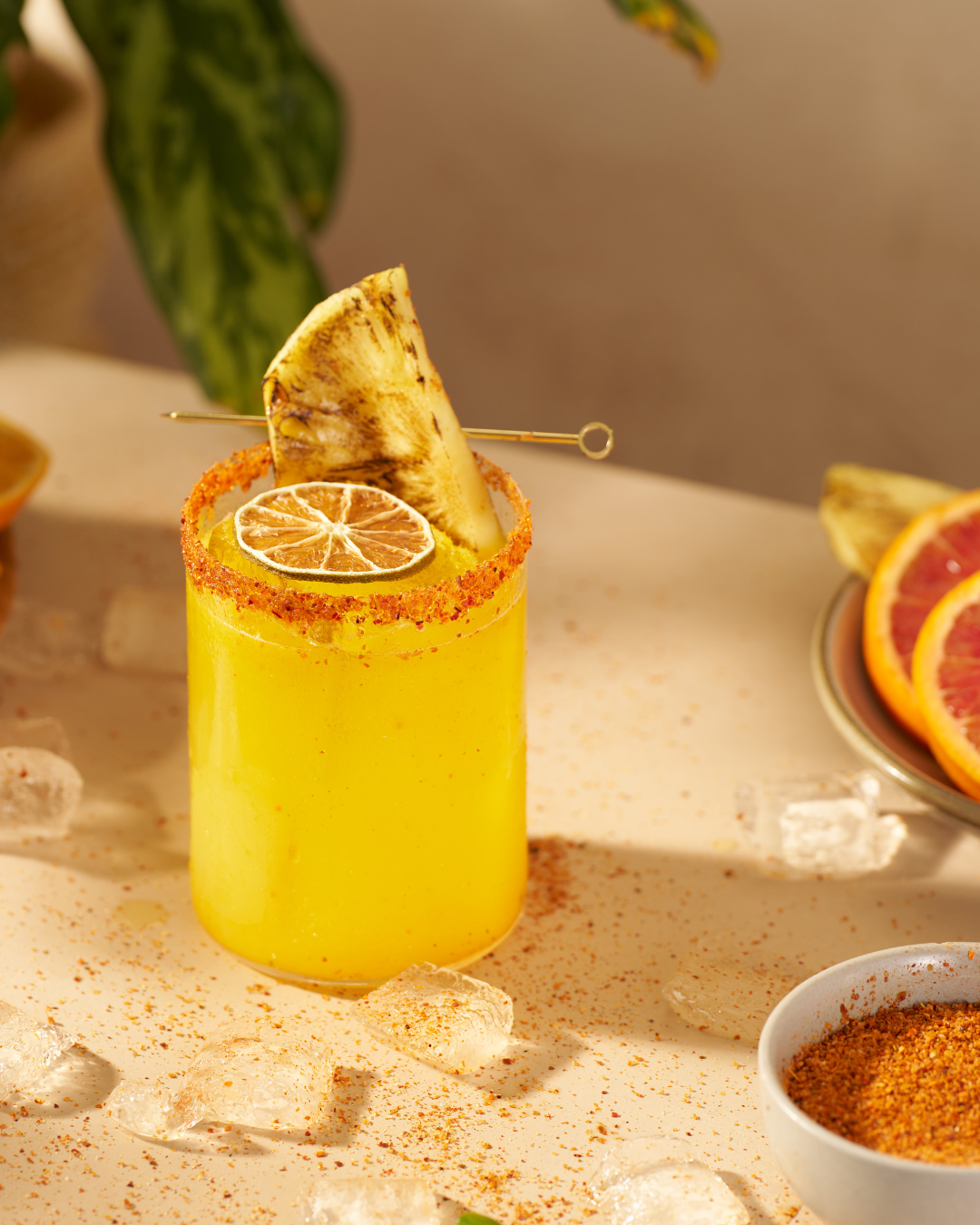 blanco tequila, fruit-infused honey, turmeric, orange, lime, Tajín