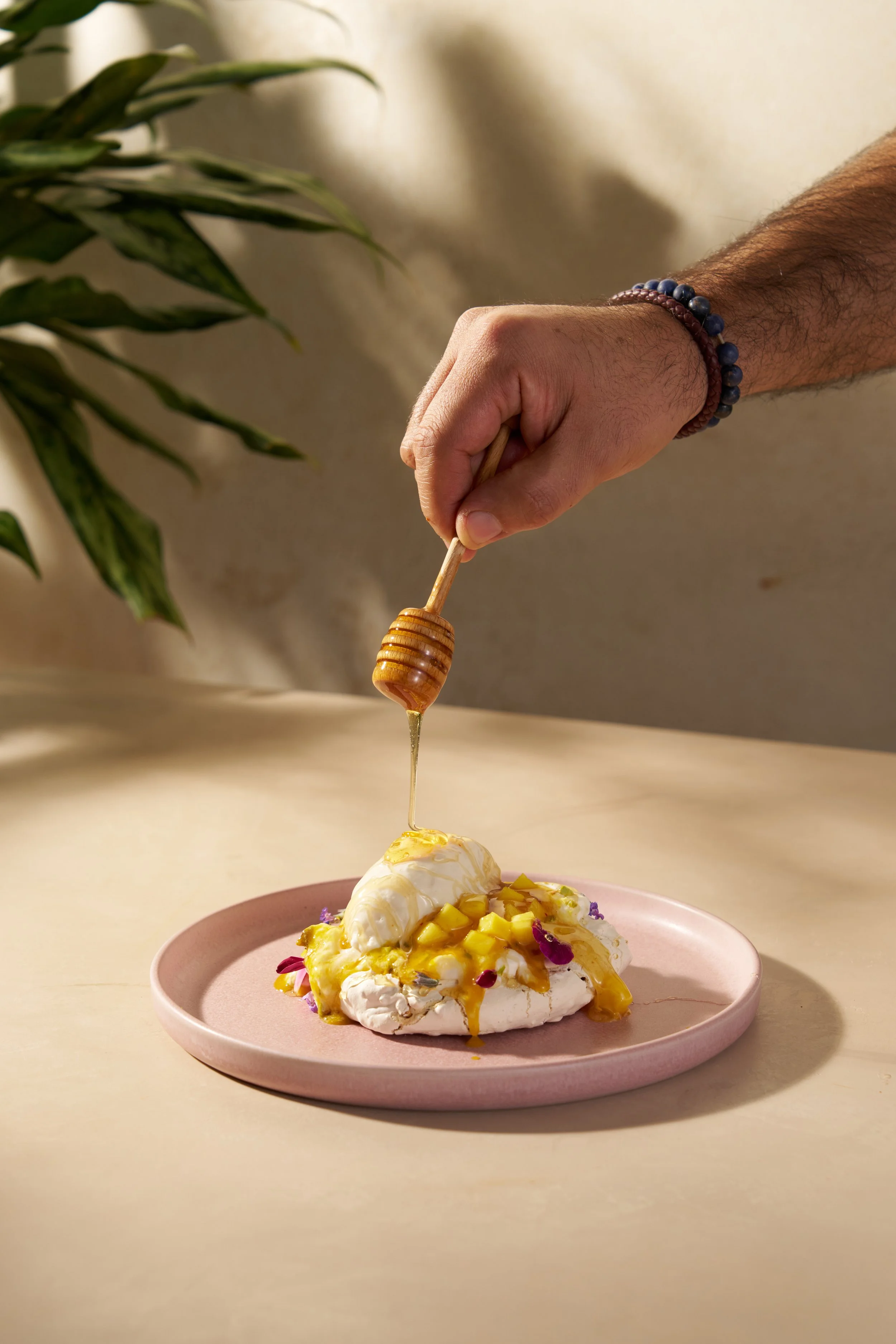 bee pollen pavlova, alma finca macerated mango, whipped cream, coconut ice cream, raw honey
